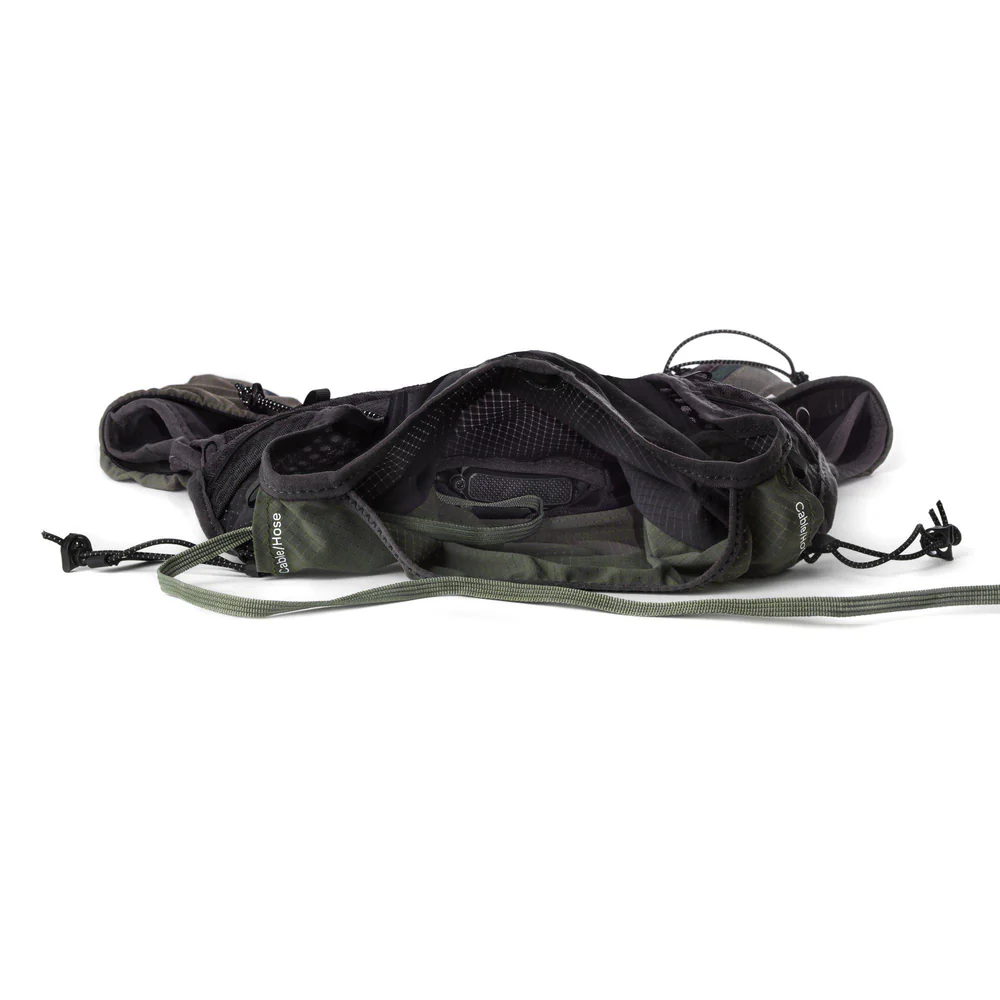 At the front, there are two bottle pockets secured with adjustable straps to keep them stable. There are also large easy-access pockets for gels, bars or gloves, two front zip pockets (one with a key hook),and a battery pocket with cable exits over the shoulders. On the back, there is a hydration bladder pocket with an outlet for the hose, and a zipped back pocket.
